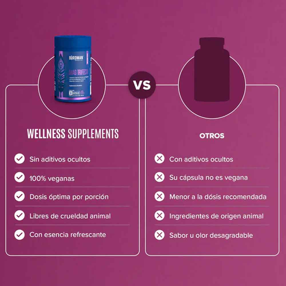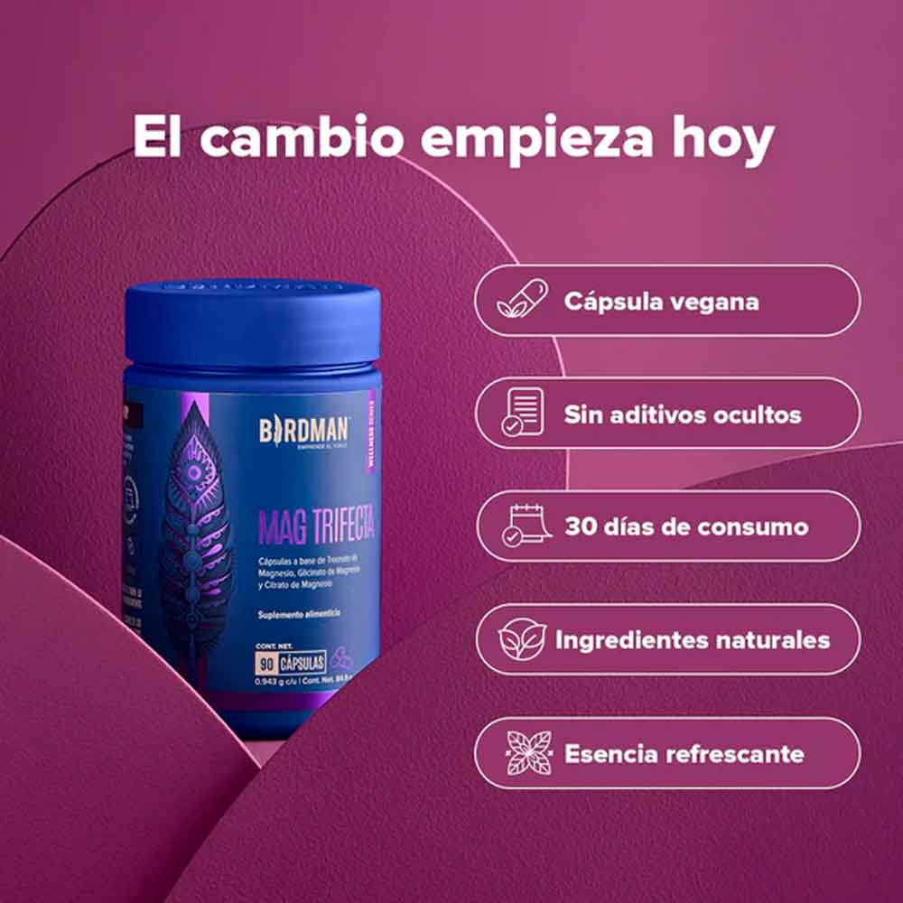 Birdman Mag Trifecta 3 en 1 es un suplemento alimenticio que combina tres formas de magnesio — citrato, glicinato y treonato — en una sola formulación diseñada para complementar la alimentación diaria y apoyar el bienestar general. Su fórmula está elaborada sin azúcar, gluten, soya ni lácteos, adaptándose a distintos estilos de alimentación.