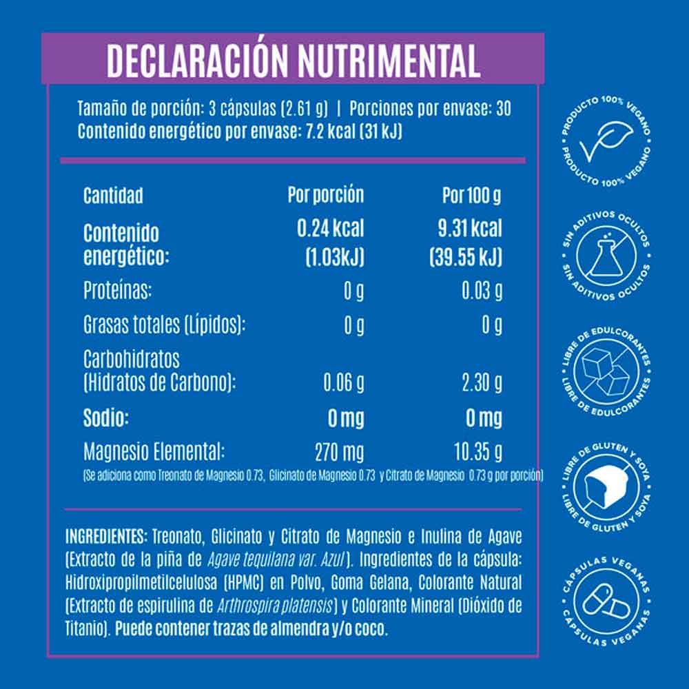 Ingredientes: Treonato de magnesio, glicinato de magnesio, citrato de magnesio, inulina de agave y cápsula vegetal (HPMC, goma gelana, colorantes naturales y minerales).