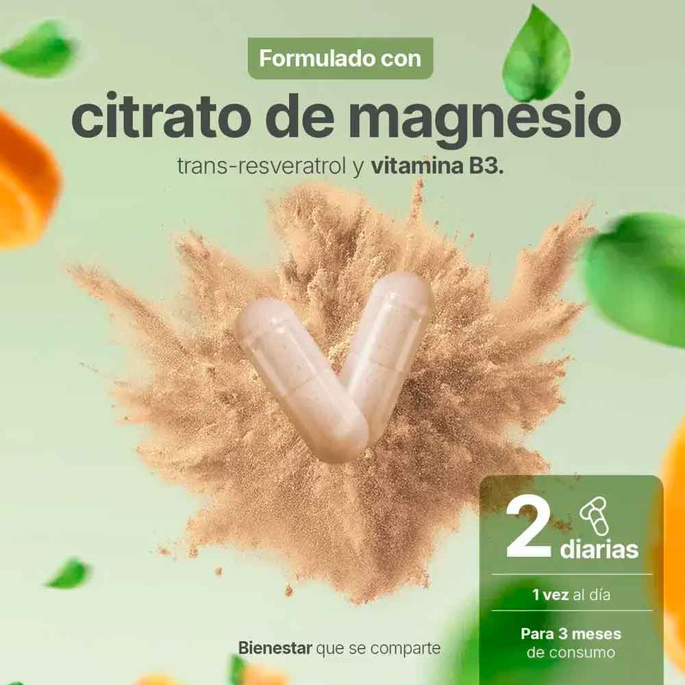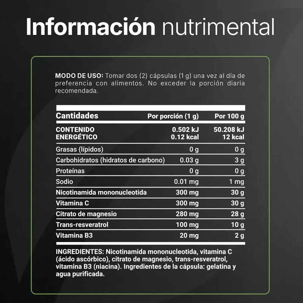 N.M.N Blend B Life® es un suplemento alimenticio que combina N.M.N., trans-resveratrol, citrato de magnesio, vitamina C y vitamina B3 en una sola formulación. Su composición está diseñada para complementar la alimentación diaria y apoyar el bienestar general.
